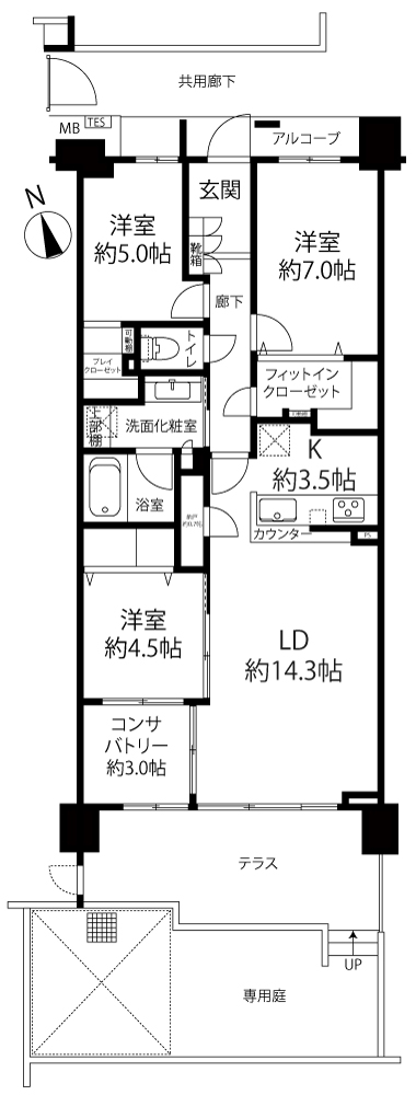| バルコニー面積 | テラス面積:14.75m²|専用庭面積:12.04m² | 所在階/構造・階建 | 1階 / RC造5階建 |