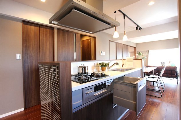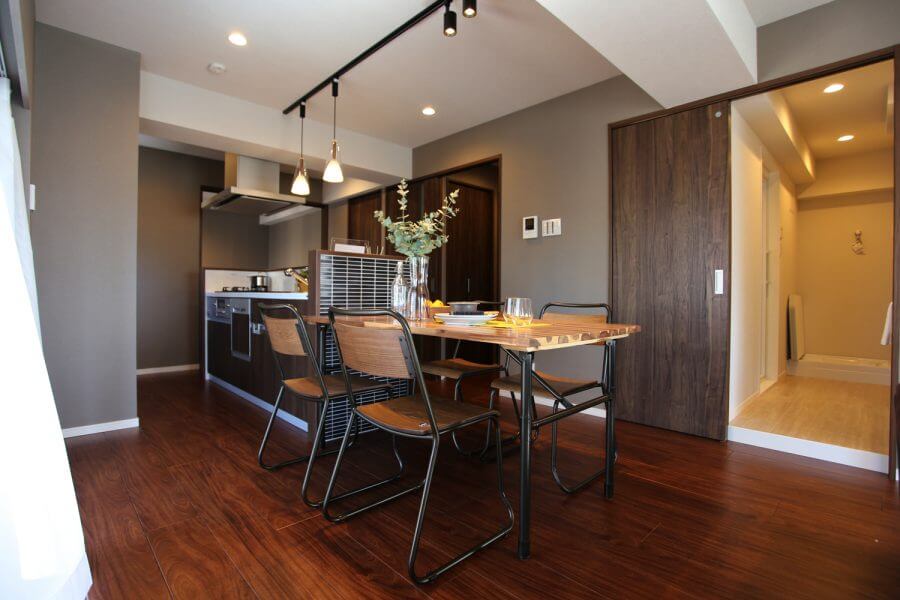 キッチンのタイル仕上げやグレーのアクセントクロスがお洒落な仕上がりになっています。