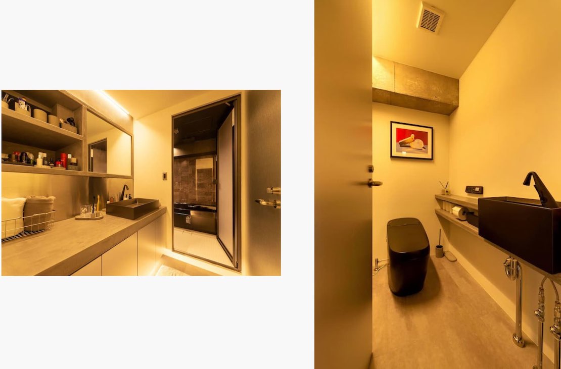 洗面室と浴室、トイレもテーマに合わせたクールな空間に。グレーを基調に、アクセントカラーに黒をイン。洗面ボウルやそれぞれの水栓、浴槽を黒で統一しました。こちらでも雰囲気作りに欠かせないのが間接照明。まるでホテルのような、シックで落ちついた空間になりました。