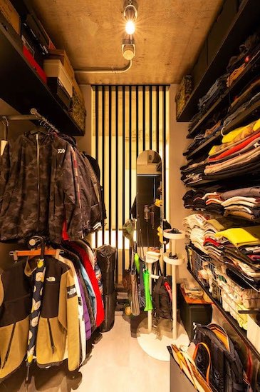 ワークスペースとの仕切りは、寝室と同様の木製ルーバーに。ワークスペースからの明かりを取り込めるので、WIC内がより明るくなります。通気性も良いので湿気対策にも。奥まった場所にあっても、ワークスペースが見えるので閉塞感がありません。