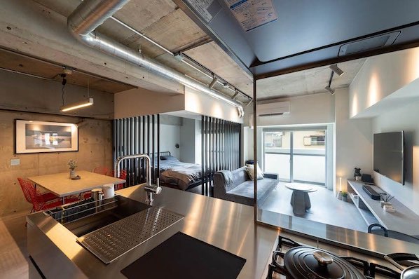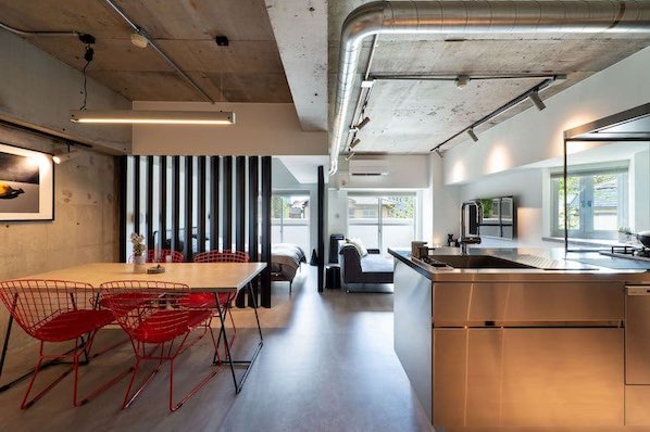 「『コンクリート・クール・ステンレス』です。旅行が趣味で海外によく行くんですけど、ここ数年でオープンしたブティックホテル(比較的に規模が小さく、オリジナリティやデザイン・サービスを売りにしているホテルのこと)やサービスアパートメント(ホテルのようなサービスが付いている賃貸物件)みたいに、仕切りがない開放的な空間にしたいと思っていました」