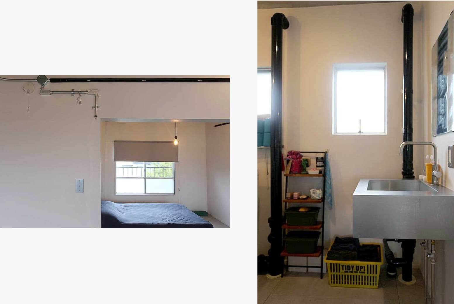 インダストリアルスタイルで多いのが、あえてのダクトやケーブル、配管の露出。これらを無骨にしないポイントは色使い。黒に塗り直して、グレーと白の空間のアクセントになっています