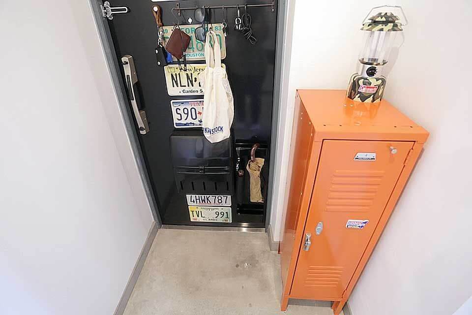 「玄関から下駄箱を取って空いたスペースには、掃除道具を入れたロッカーを設置しました。基本的に収納は家具で済ませています。もとから好きな家具のブランドあって、収納はそれを使いたかったんです。インテリアでもファッションでも、暗めの色の中にポイント使いでヴィヴィットカラーを取り入れるのが好きです」