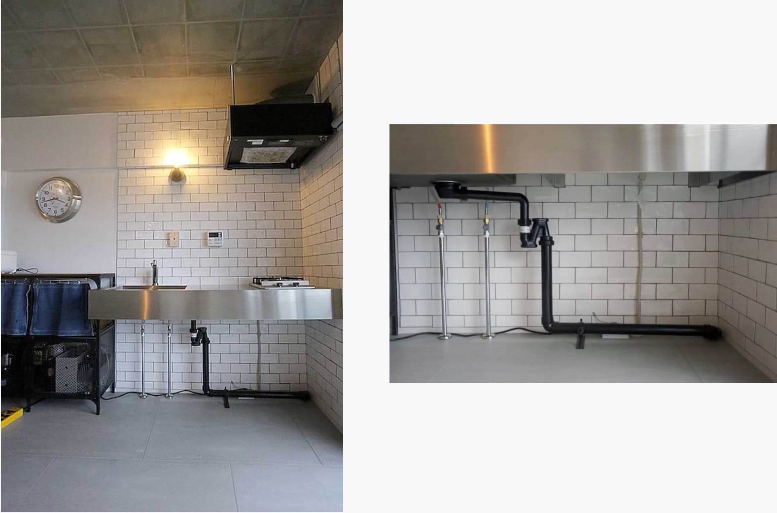 キッチンはインダストリアルスタイルで人気のステンレスキッチンを設置。埃がたまらないように掃除のしやすさを考えて、シンク下収納のないシンプルなものを選ばれました。あえて見せている配下やダクトがまたおしゃれな雰囲気。