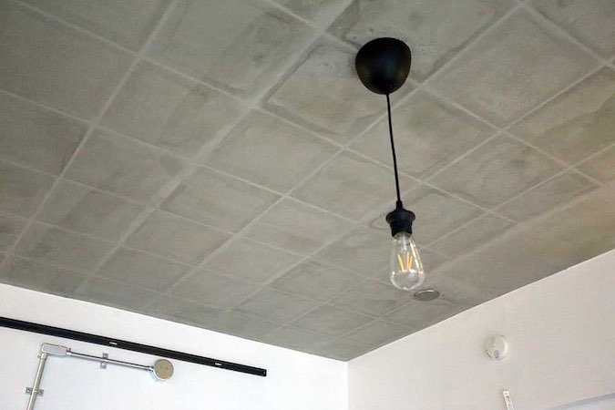 天井はインダストリアルスタイルの定番・モルタルを塗りました。化粧板を取り壊し、断熱材の上にモルタルを塗って無機質な印象に。