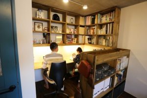 奥様:家族がリビングにいる時間が長いので、子どもが勉強していても、ダイニングにいても、家族と話ができる空間がいいなと思って、角に書斎コーナーを設けて、繋がりを大切にしました。