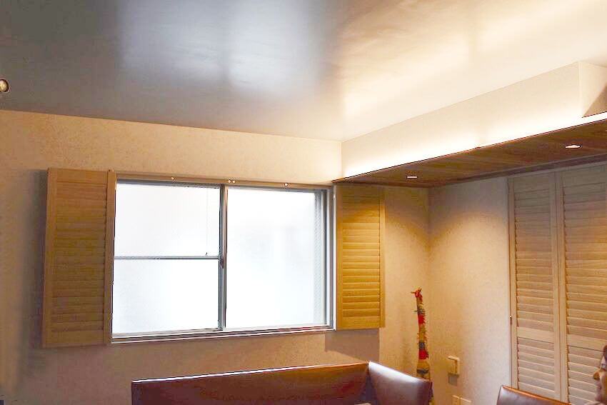 もう一つは下がり天井。デザイナーに渡したイメージの中に無垢の下がり天井があり、取り入れました。無垢の濃いブラウンを際立たせ、ヴィンテージ感を引き出すためにデザイナーが考えた結果、壁の色をグレーにしました。間接照明を取り付けたことで、落ち着いた大人な雰囲気を作り出せます。下がり天井で大人な雰囲気だけでなく、ご主人のご要望だった電動プロジェクタースクリーンを埋め込むこともできました。リノベーションではこのように、様々なスペースを希望に合わせてデザインしていくことが可能です。