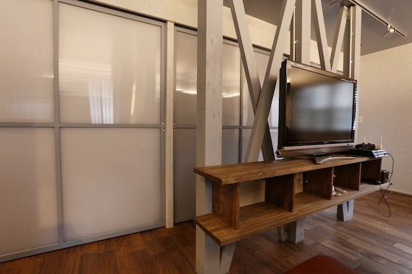 リビングに入ると目を引くのが、こちらのテレビボードです。リビングのシンボル的存在ですが、X字の柱の正体は、取り壊した壁の中にあった柱。このように取り払えない柱は、その形を活かしてこのようにアイコニックな存在に変えることが可能です。柱が室内に溶け込むように、壁に合わせてグレーに塗装。色を統一することで一体感が生まれます。テレビボード本体は、床材のブラックウォルナットとトーンを揃えた木材にしています。
