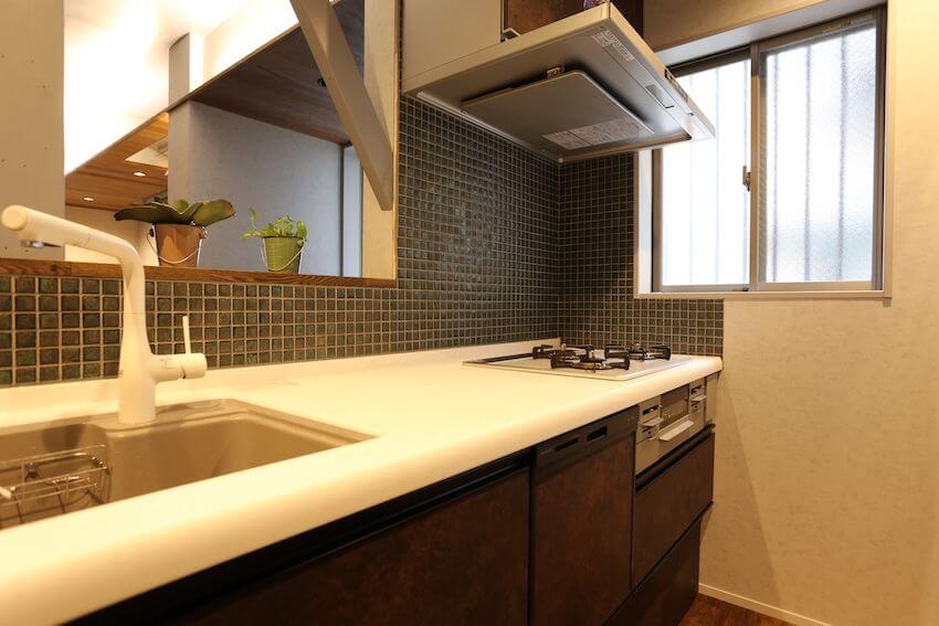 キッチンの壁にはブラジル産のタイルを施しました。一つひとつ焼きムラがあって、色味も微妙に異なるのが特徴です。カウンターの面材のブラウンと味わい深いグリーンは相性抜群。背面に作業台も造ったので、前後の小さな動きで作業ができる便利なキッチンになりました。