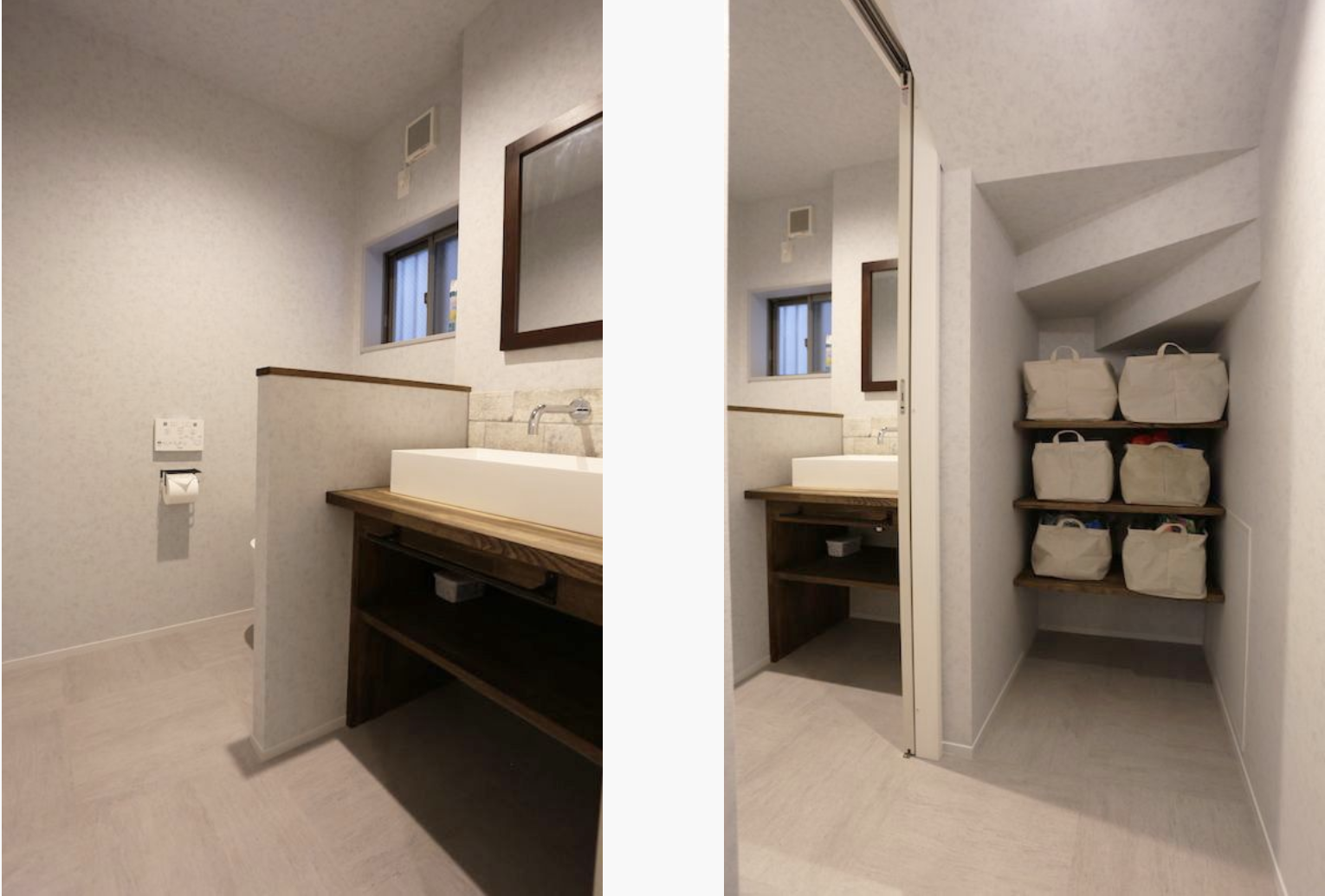 元々は単独だったトイレですが、ホテルライクなゆとりのあるトイレにしました。階段下収納の手前のスペースはレストルームの前室になっていて、トイレ+手洗いの空間=レストルームに取り込むことにより贅沢な空間を演出しています。階段下収納の壁下には点検口がついているため、人が出入りしやすいように稼働棚にしているそうです。