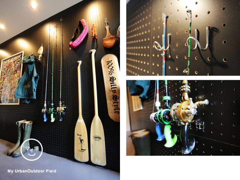まずこのポスターは、リビングからの扉を開けて正面ってポジションがいいと思うんですよ。ポスターがあって、レインウェアを掛けて長靴をその下に置く。で、タックルがあってライジャケもネットもフックに掛ける。・・・このネットお気に入りなんですよ。