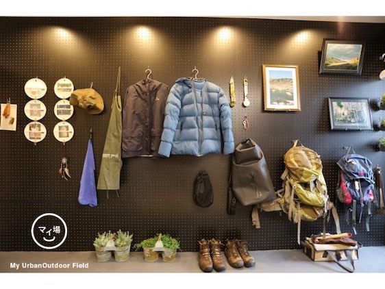 あとはちょっと内側にアウター系を。入口すぐは置きすぎずにライトにしたほうがいいよね。お客さんもくるし。アウターはこれ、焚き火でも使ってるんで絶対部屋の中に入れたくないやつです。一応スノーピークなんですけど(笑)
