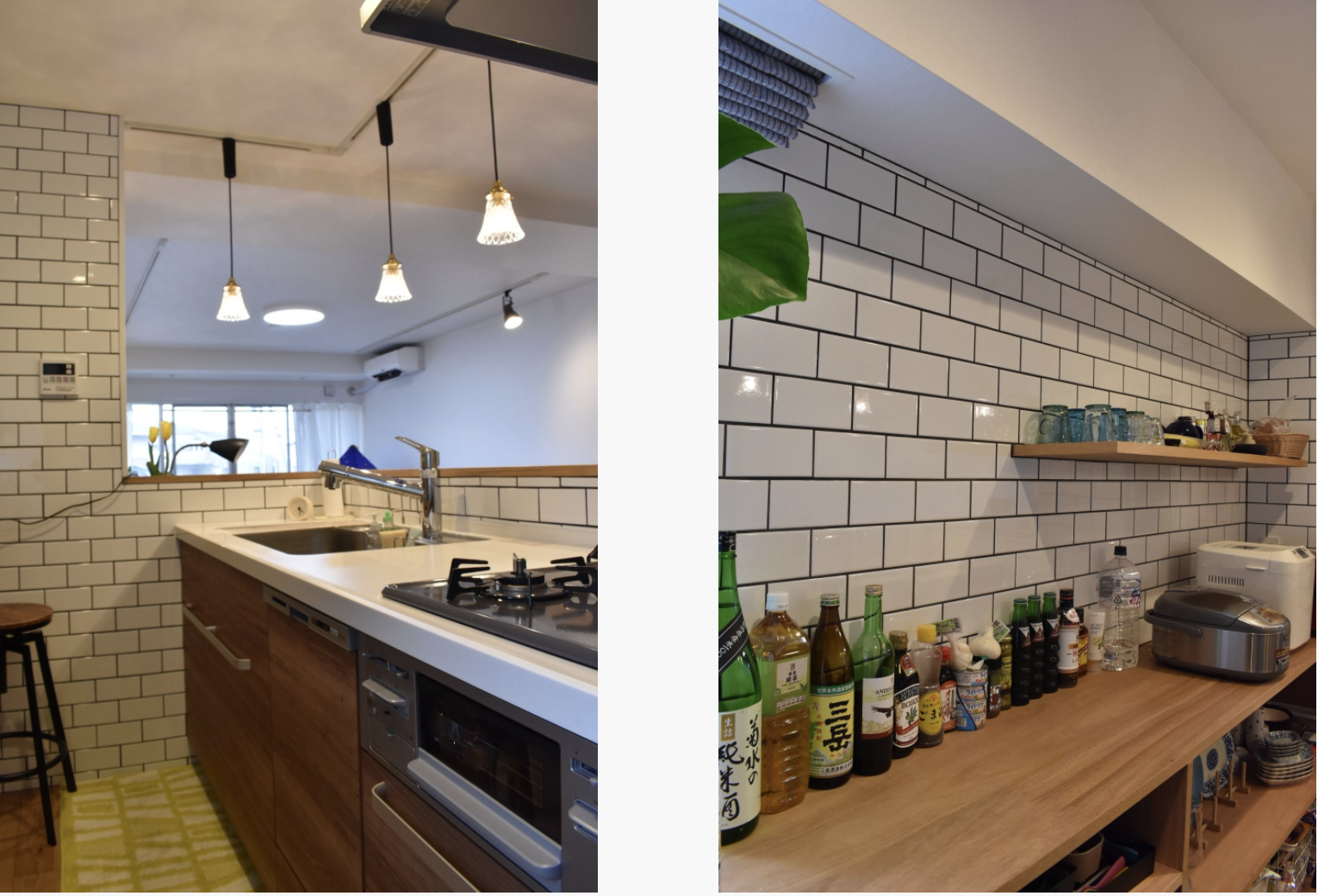 また、キッチン内の壁には白タイルを施しています。白タイルでもポップすぎない印象なのは、目地を黒くしているからなんですね。目地の色でタイルの印象は大きく変わるのがわかります。