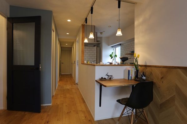 「縦長なので、この長さを活かす間取りを考えるのにとても苦労しました。元の間取りでは、キッチンが今の位置ではありませんでした。クローゼットを造るにあたって、キッチン位置を移動する必要があったのですが、大幅に変えると今度は配管が難しくなるという問題が出ました。最終的に今の位置に落ち着き、さらに収納も作ることができたので結果として良かったのですが、配管の問題というものがあるんだと思いました。このマンションはこの辺りでは古いそうで、施工が大変だったのではないかと思います。当初の希望から変更する部分はあったものの、対面キッチンになったり、玄関がホテルのようになるなど、自分では想像できない仕上がりになったので、結果的に満足です」
