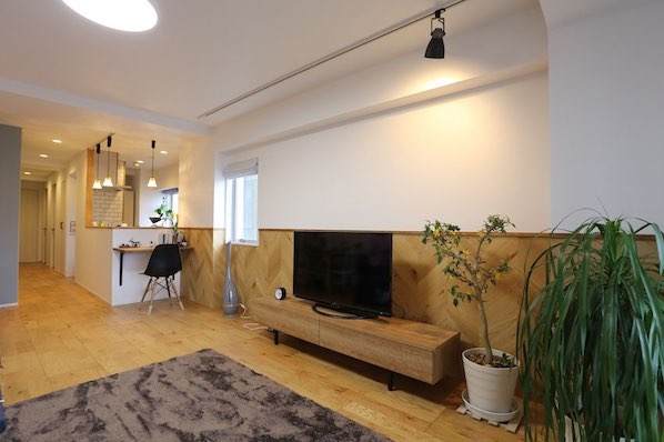 リビングの壁にはヘリンボーンでアクセントが効いています。このウッドパネルは下半分だけに使用することでメリハリがつき、オシャレになります。広い壁とウッドパネリングのコントラストが一気にカフェのような雰囲気を演出してくれています。