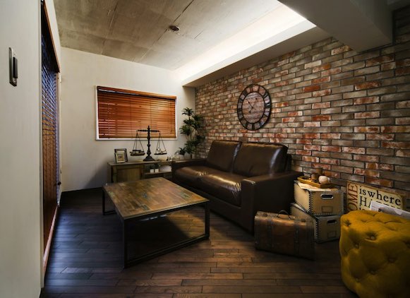壁一面に貼られたブリックタイルがめちゃくちゃカッコイイ、リビングスペース。