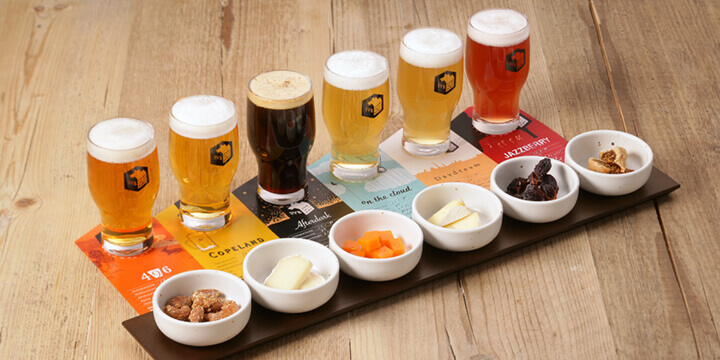 また、見た目にも美しいオリジナルのクラフトビールが何種類もあって迷ってしまうのですが、6種類の飲み比べセットが最初はオススメです。