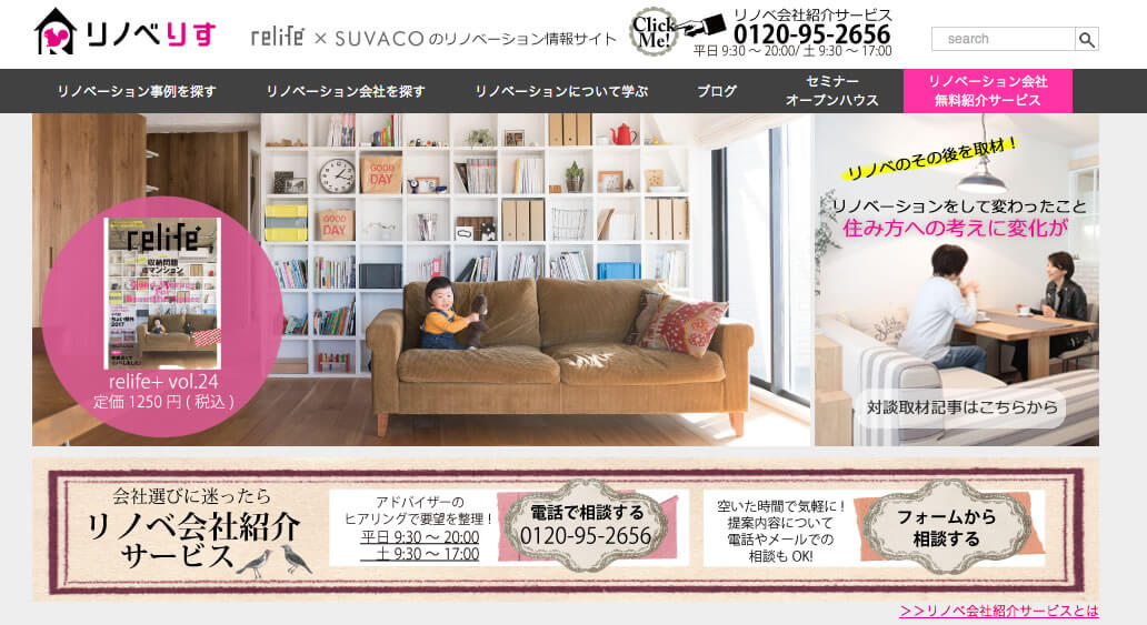 リノベーション雑誌である「relife +」を発行する扶桑社とSUVACO社が共同で立ち上げたサイト。全国100社のリノベーション会社の事例が見られて、会社の特徴がわかるサイトです。リノベ会社紹介サービスを使えば、電話相談で、理想のリノベーション会社を3社程度紹介してもらえる便利なサービスです。