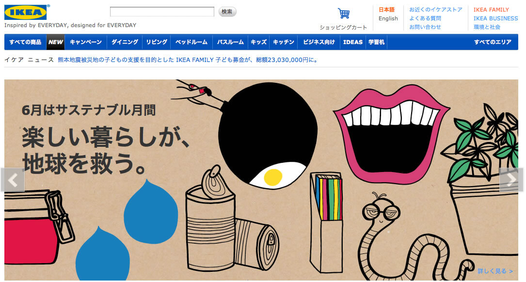 IKEAは、4月から全店でECを開始しています。宅配料金は若干高いかもしれませんが、ネットでIKEAが買えるとなると劇的に便利になりますね。同サイトにおいては、IDEASというコーナーがあり、IKEA製品を使ったアイデアの記事が見られ、とても参考になります。IKEAは、週末に家族で出かけていく場所でしたが、ECサイトができたので、ネットで選んでそのままオーダーできるのがいいですね。