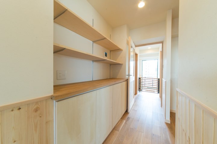 廊下や居室の壁にはワンちゃんが引っ掻いても問題の無いように腰壁を設え、オシャレに丈夫な壁面を。