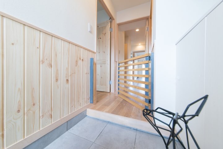 玄関スペースに設けたオリジナル造作の柵もワンちゃんのための特注品。大事なワンちゃんと安全に一緒に暮らすためには必須のアイテムです。