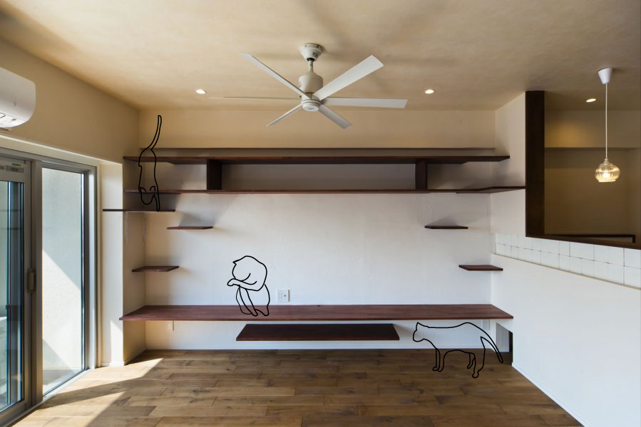 それぞれの部屋を自由に移動できる通り穴に、リビングにはあの子が1日中部屋にいても飽きないように、毎日コロコロ変わる気分に合わせた、高い場所が大好きなあの子のためのキャットウォーク。他の家族の誰にとってもストレスがない、ゆるやかに繋がるひと続きの住まいに仕上がりました。