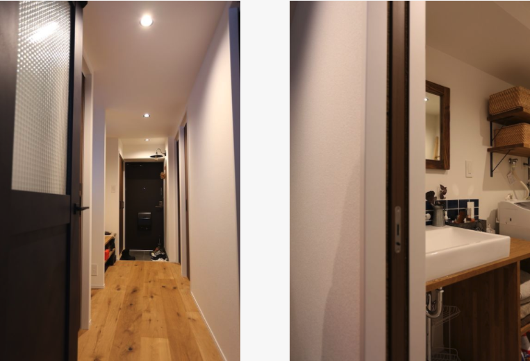 廊下のゆとりを引き立たせるため、極力視界を遮らない工夫として、扉にはインセット扉を採用しました。壁の中に扉が収まって隠れるので、開けたままでも生活感を感じさせません。これによって、ゆとりとすっきり感が同居した廊下になりました。ちなみに、インセット扉は引き出す時は扉を押せば出てきます。
