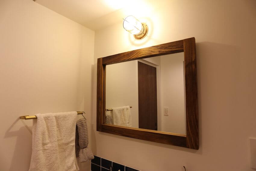 洗面脱衣所も木材を使い、温かくナチュラルな空間に仕上げました。こちらのタオルバーとミラーはKさんが選んだものです。
