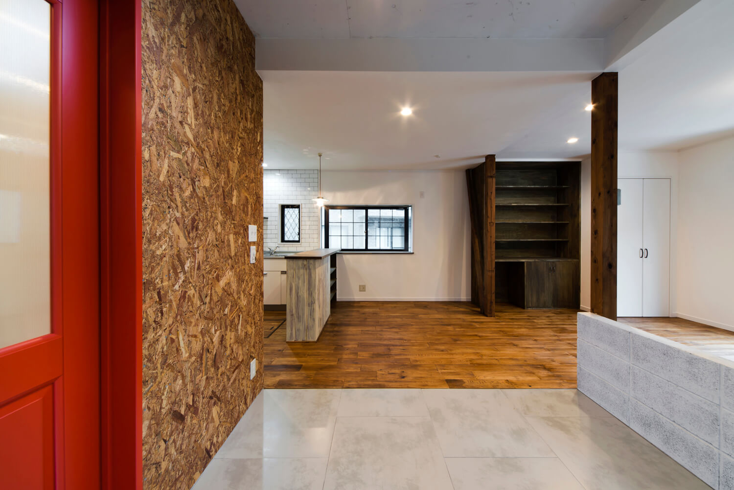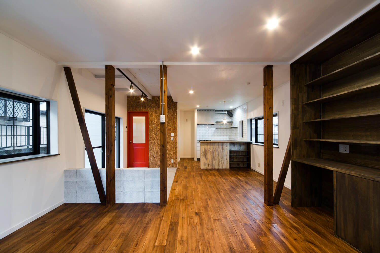 赤いドアを抜けると、こんなリビングが待っています。ザクザクと縦に並ぶ柱。ずっと使い込んできたかのような深い色味の棚。キッチンの白いカウンターも雰囲気たっぷりです。