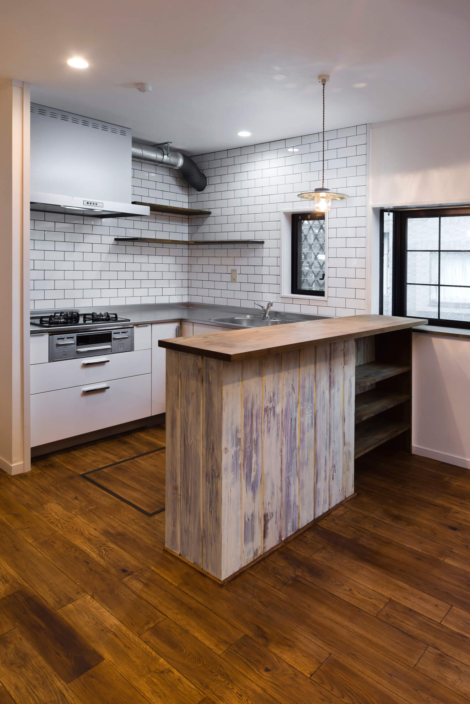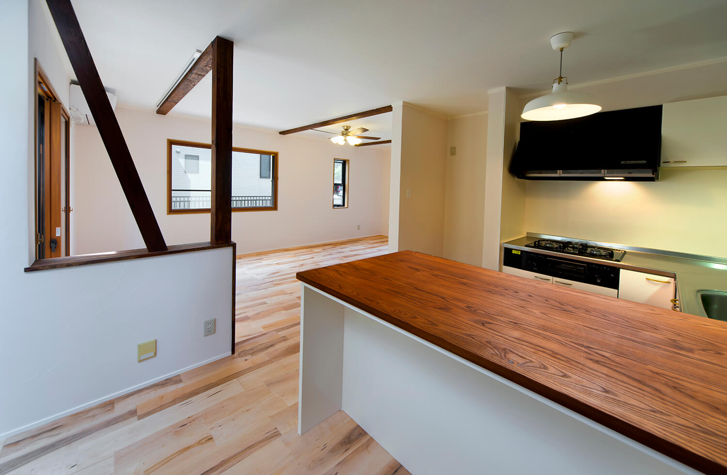 最後は、キッチンエリア。大きなカウンターテーブルは、実用性抜群です。戸建てならではの、柱。完全に視線をさえぎることなく、キッチンエリアとリビング部分をわけています。戸建てリノベを希望される方の中に、「柱・梁(はり)がある家」をお求めになる方がいらっしゃいます。これまでの事例のご紹介を通して、柱や梁っていいもんだな、って思われた方もいるのではないでしょうか。