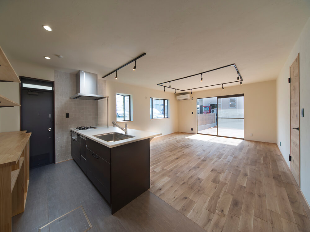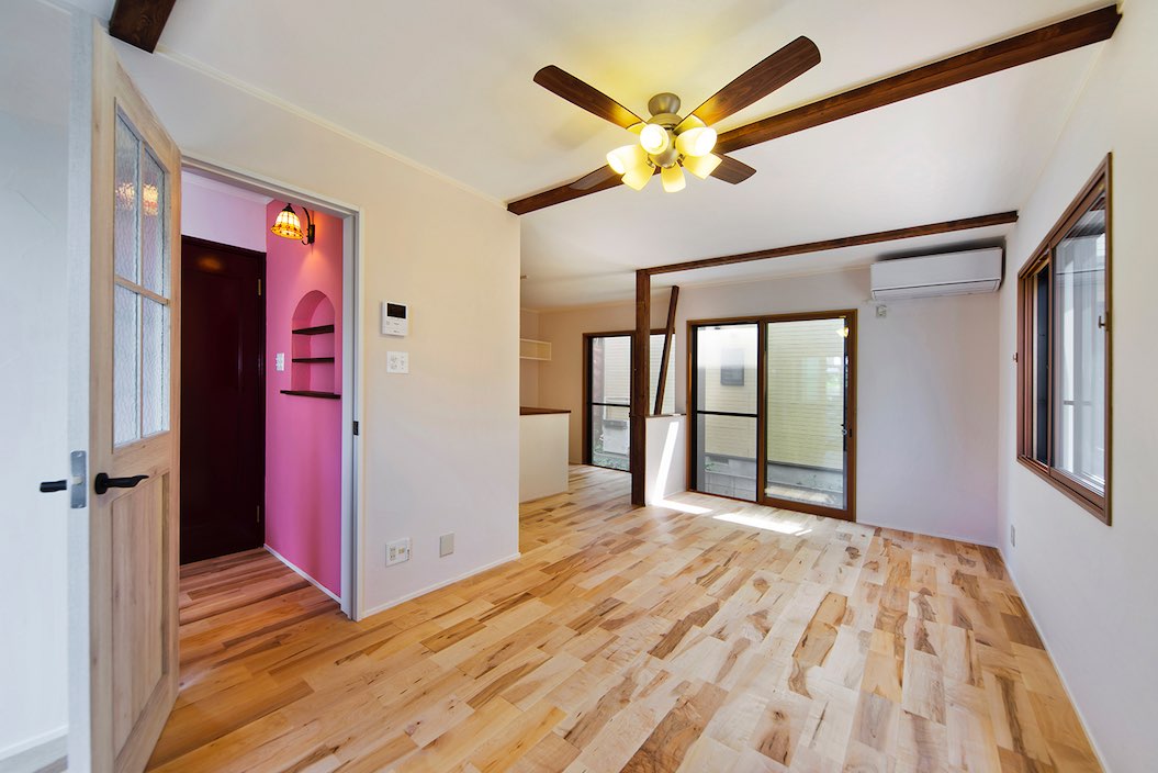 廊下を抜けるとリビングです。シーリングファンが目をひく明るい空間です。廊下に用いられているものと同じ木材をひくことで、玄関からリビングまで空間が途切れることなくつながります。