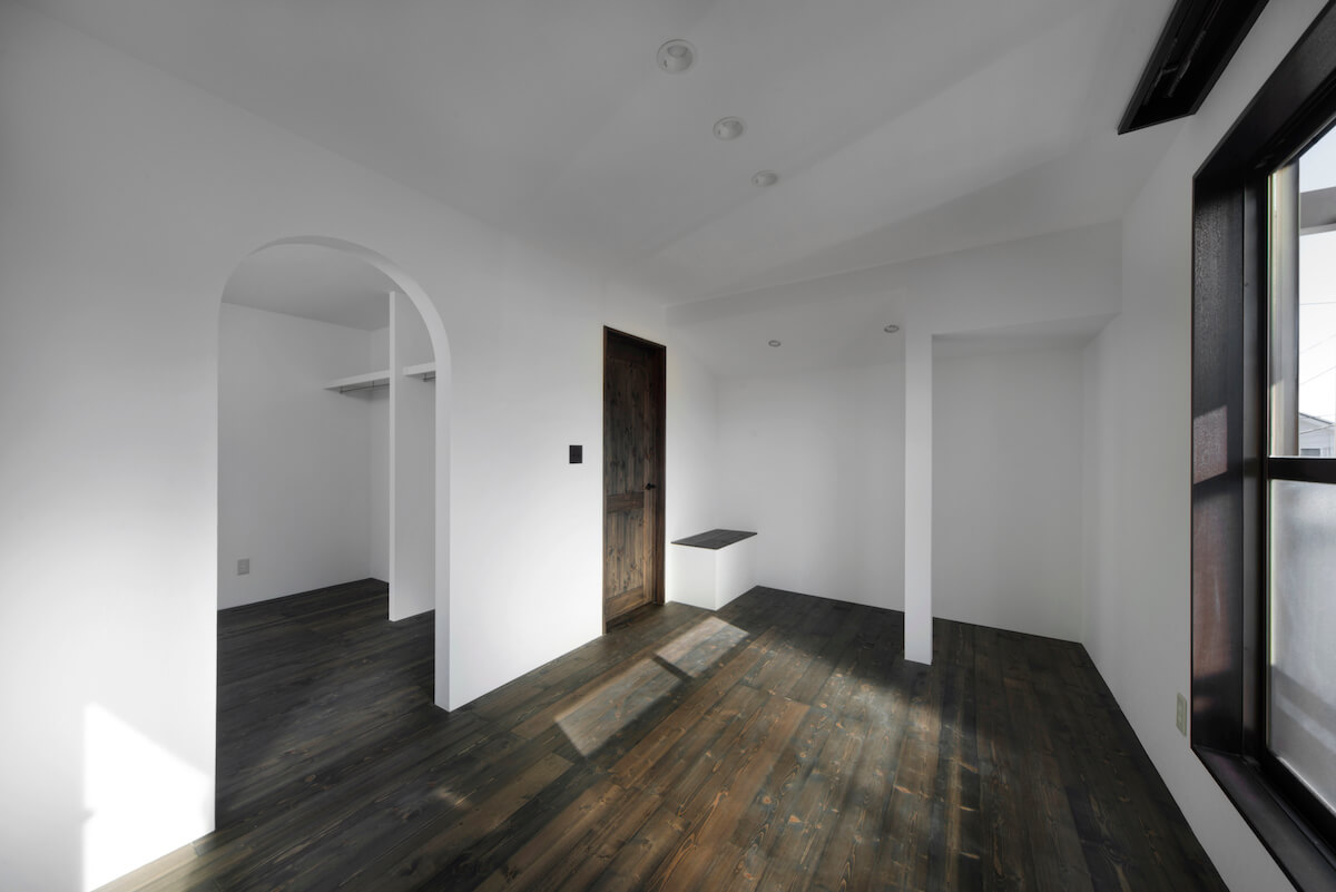 もう一つのお部屋。こちらも家全体の統一感のまま、深い色味の木材が個性的です。ウォークインクローゼットは、ドアなどで閉ざさないことで部屋をより広く見せます。