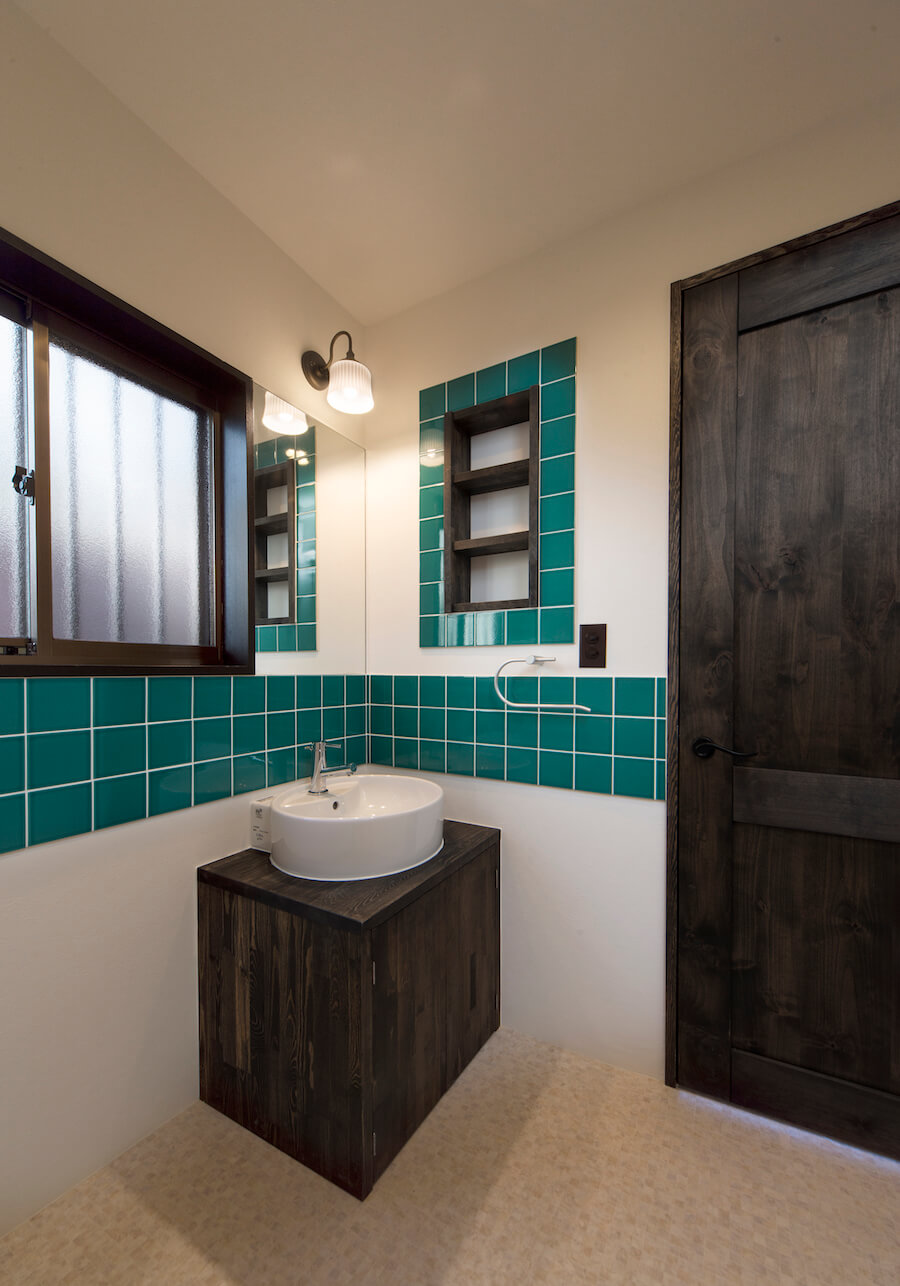 水回りももちろんレトロ。ブルーのタイルがアクセントです。玄関からリビング、水回りにいたるまで、渋く深い色味の木材によって、統一感があります。
