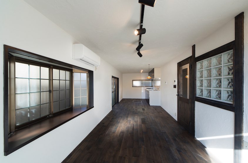 この渋み。深いです。白い壁に黒に近い色味の無垢材が映えます。右側のガラスブロックもレトロな雰囲気を醸し出しています。光を取り込みつつも、非常に落ち着いた室内になっています。