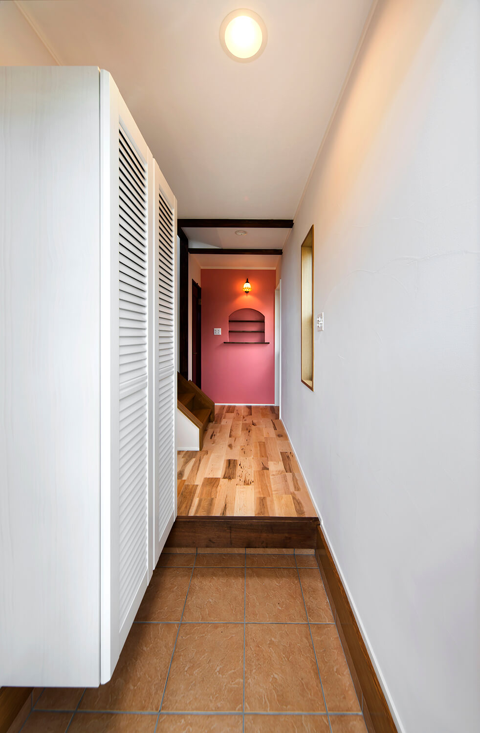 玄関からちらり。目の覚めるようなピンクです。毎日、帰宅して、ドアを開けるたびに、廊下の先に見えるこのピンク。自分の好きな色が、毎日目にするところにあると、日々いきいきと生活できる気がします。