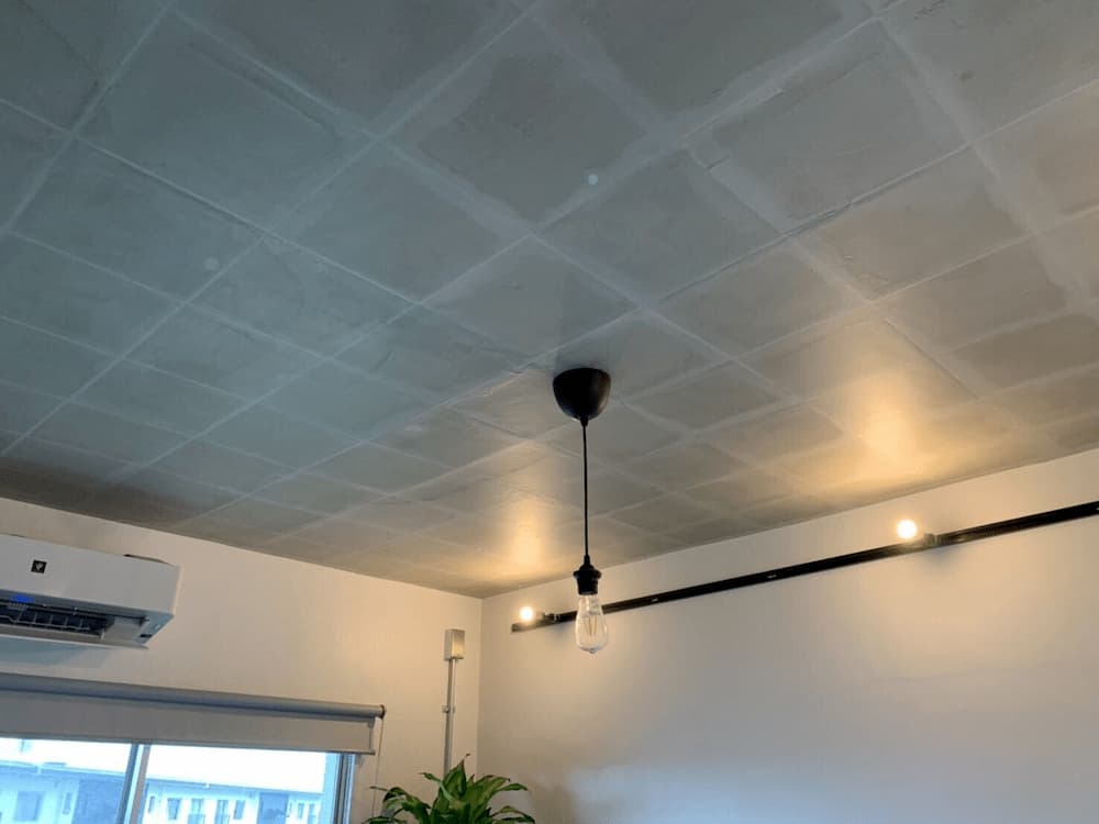 この天井は、骨材を軽くしたモルタル仕上げなのですが、そもそも、モルタルを天井仕上げにすることは難しいこと、ヒビが入る、天井の塗り物が落ちる、ボロボロになるなどのリスクが高いことがあります。それを説明したところ、『その雑な感じが良い』と言われたのです。