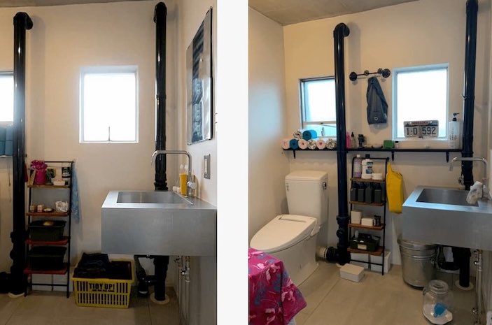 サニタリーに、こんなインダストリアルな洗面ボウルを付けるというアイデア。テーマからのブレがないのが、馴染んでいる理由です。