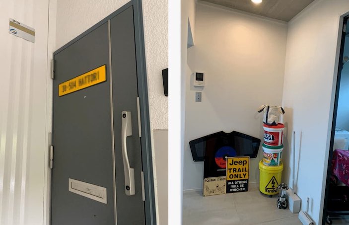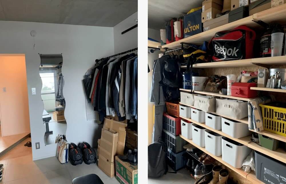 写真左からは、玄関ポーチが斜めになっていて、そこからクロゼットまで一続きの土間なのがわかりますね。パイプにかけられた服類の向かい側には、写真右の収納棚が。壁のOSBボード(今リノベーションやDIYで人気です!)にダボレールを取り付け、稼働棚を設置しています。