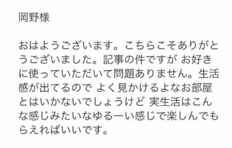 こちらは、写真使用についてお伺いした際のお返事メールです(岡野は施工管理責任者)。