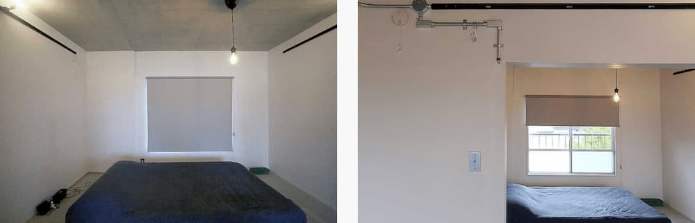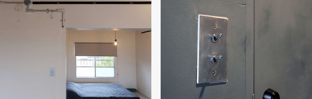 ベッドルーム手前の壁にスイッチがあるのが見えますでしょうか?これが、トグルスイッチです。これが一般的なプラスチックのスイッチだったらどうでしょうか。このトグルスイッチは、今やインダストリアルスタイルに欠かせないアイテムとなっています。