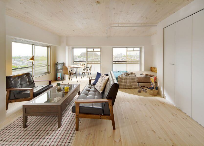 2面から光差し込むこのお部屋。見晴らしがよくさえぎるものがありません。もともと明るい物件だからこそ、シンプルに光が広がるように。細い床板を部屋中に敷き詰め、天井も同じ素材でパネリング。光がやわらかく反射していき、白が基調のリビングに黒色のソファーがワンポイントで映えます。