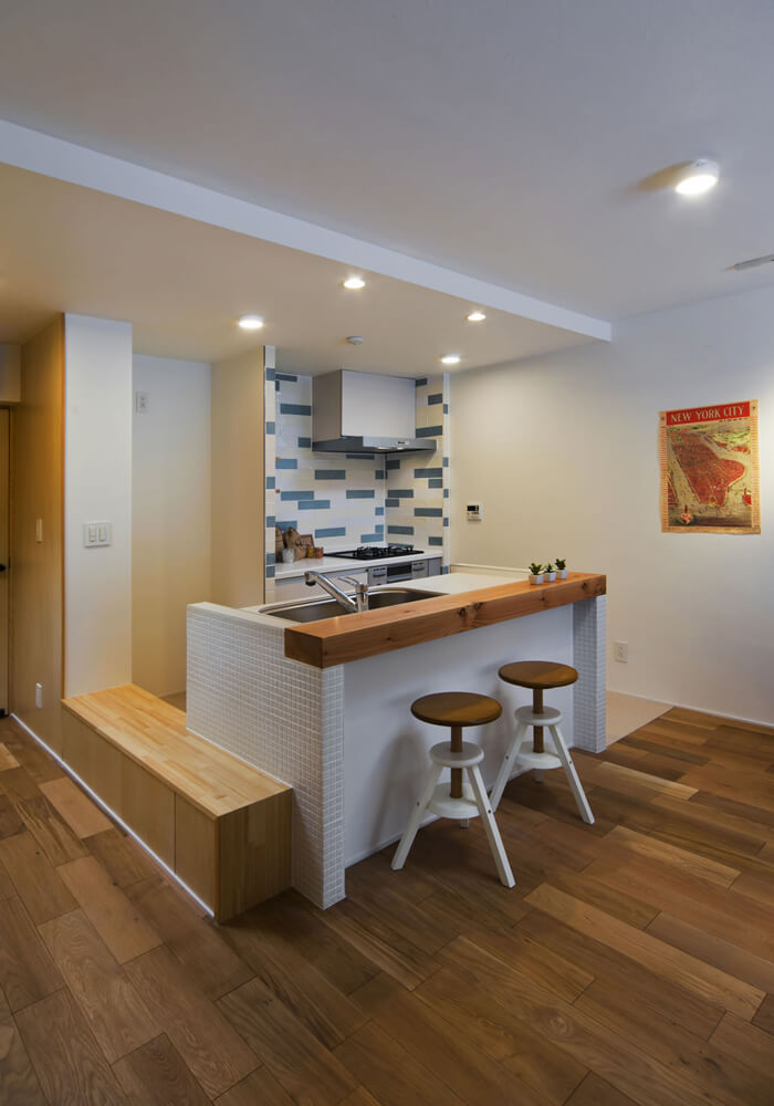 さわやかな色合いのタイルを用いたアイランドキッチンには、カウンターも設け、利便性を高めました。スリットの間仕切りを設けることで、シンプルな室内に対し、スムーズに収納家具などを取り入れやすく仕上げています。目線がスムーズに流れる広がりのある空間になりました。