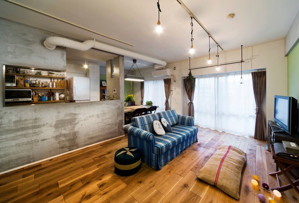 リビングで一番目を引くのが、打ちっ放しのコンクリートで囲まれたキッチン。青色基調のソファーが、コンクリートによく映えます。ダイニングテーブルとその上の蛍光灯がレトロな無骨感を醸し出しますが、それが居心地のよい生活感を演出します。