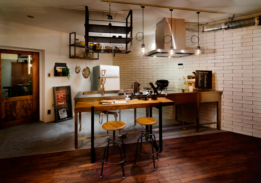 天井の質感。壁のレンガ張りのタイルの目地の色、太さ。斜めに貼っていった味のある床板。全く異なる素材たちが、そのディティールのこだわりによって調和し、アメリカンテイストを作り出します。やわらかな間接照明が、その空間に光を落とします。