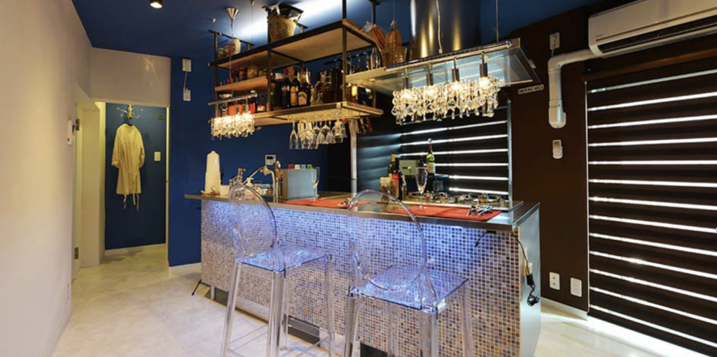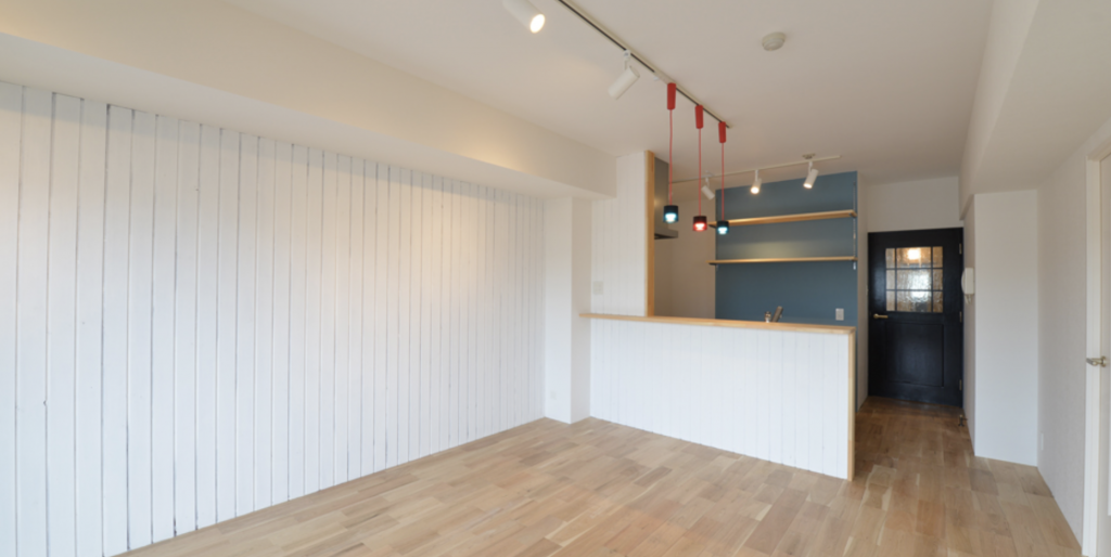 こちらのリノベーション事例は、中古の団地物件を購入されてリノベーションを実施したFさん(仮称)の事例です。もてなし好きのFさんは、友人相手に腕をふるう、スタイリッシュなバーのような空間のリノベーションを選択しました。上からぶら下がったグラスたちや、絶妙な照明がバーのイメージを引き立てています。