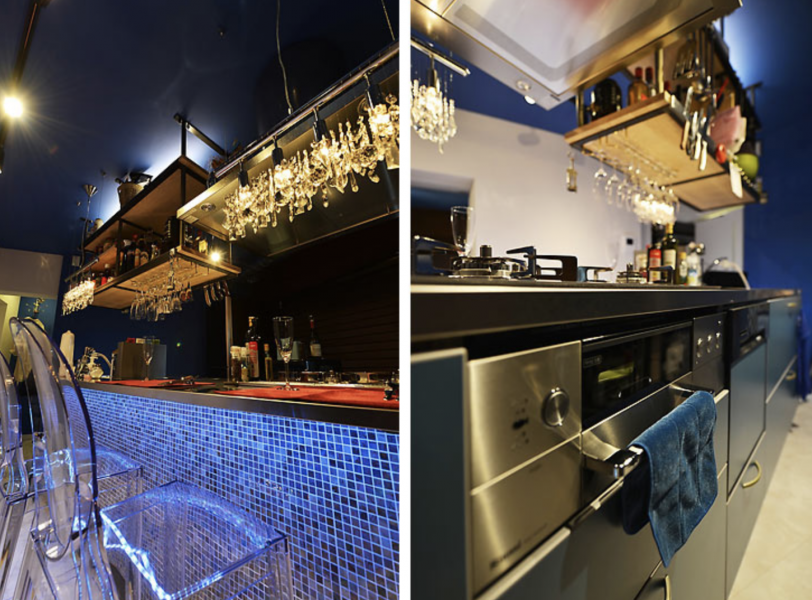 (写真左)モザイクタイルで仕上げたカウンターに、アクリル製のカウンターチェア。おしゃれなバーの雰囲気 (写真右)トーヨーキッチン製のアイランドキッチンは引き出しタイプの大容量収納