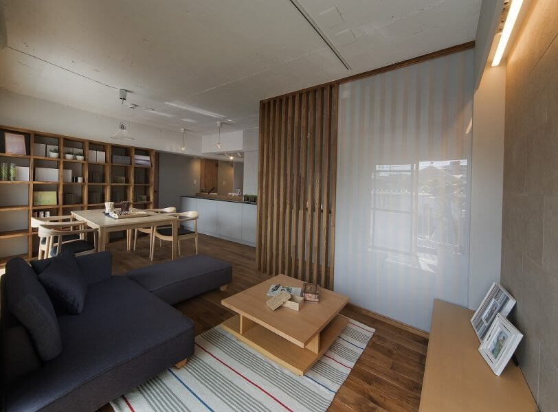 新たな収納を設ける際には、限られたスペースを有効活用するのが一番賢いやり方です。この事例では、寝室とリビングの間仕切りの機能だけの壁をつくるのでなく、一面に木製の棚を設置しました。