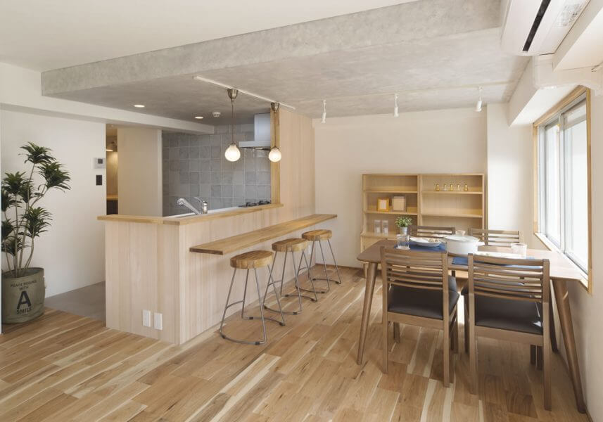 『こんなダイニングを待っていた!』と心の中でガッツポーズしたくなるような、いいとこ取りのダイニングキッチン。窓際のダイニングテーブルに加えて、カウンターも単なる飾りではありません。実用性しかない3席横並びです。