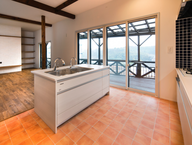 少しこぶりの洗い場と、コンロ・グリル台。ぐるっと一周歩き回れるスペースは、確実に家族のコミュニケーションを増やすはず。この家だと、作った料理をそのままテラスに運んでいってもよさそうです。フローリングとの切替えのオレンジタイルは、視覚的により一層料理を楽しくします。