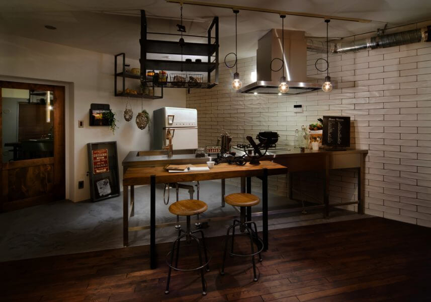 壁のレンガ張りのタイルの目地の色、太さ。そして、イギリスの片田舎の縫製工場の壁面にて100年風雨にさらされてきたかのようなレンガの色味、エイジング具合です。部屋全体の雰囲気も、間接照明の明るすぎないぼんやりとした光と斜めに貼っていった味のある床板が、使い込んできたかのような空間です。